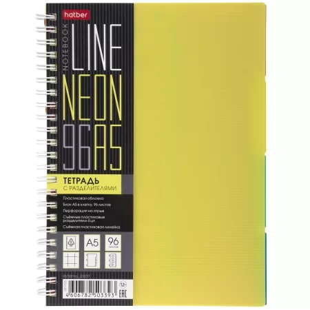 Тетрадь 96л А5 ЕВРО 145X205мм клетка Пластиковая обложка на гребне LINE NEON 4 цв. разделителя с линейкой Желтая в индив.упак.
