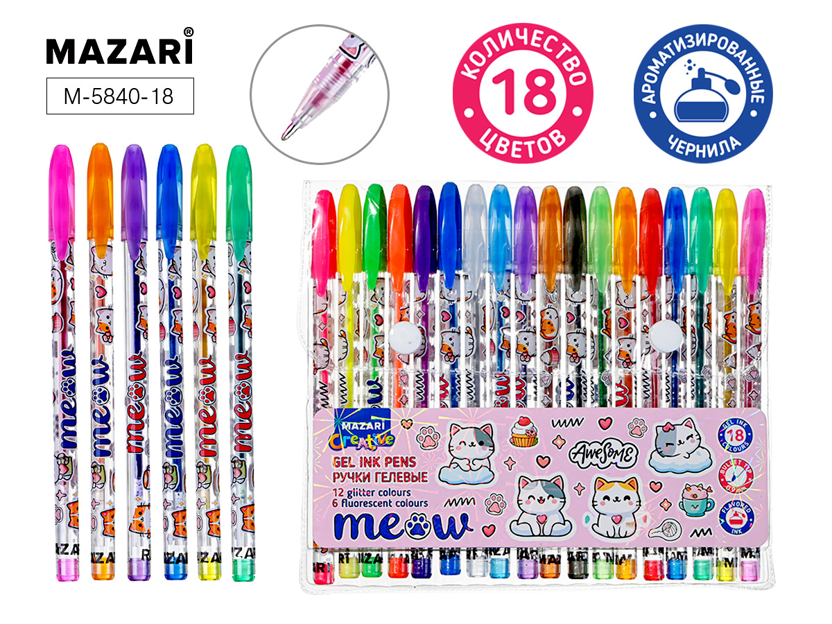 Ручки гел. в наборе с блест. Mazari Meow 18цв